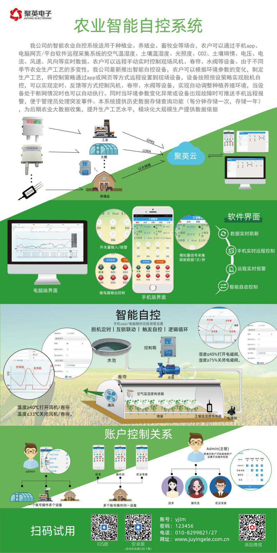 我公司的智能農業自控系統適用于種植業、養殖業、畜牧業等場合,農戶可以通過手機app、電腦網頁/平臺軟件遠程采集系統的空氣溫濕度、土壤溫濕度、光照度、CO2、土壤嫡情、電壓、電流、風速、風向等實時數據。農戶可以遠程手動實時控制現場風機、卷簾、水閥等設備。由于不同季節農業生產工藝的多變性,我公司最新推出智能自控設備,農戶可以根據環境參數的變化,制定生產工藝,將控制策略通過app或網頁等方式遠程設置到現場設備,設備按照預設策略實現脫機自控,可以實現定時、反饋等方式控制風機、卷簾、水閥等設備,實現自動調整種植養殖環境,當設備處于斷網情況時也可以自動執行。同時當環境參數變化異常或設備出現故障時可推送手機遠程報警,便于管理員處理突發事件。本系統提供歷史數據存儲查詢功能(每分鐘存儲一次,存儲一年),為后期農業大數據收集,提升生產工藝水平,模塊化大規模生產提供數據依據
