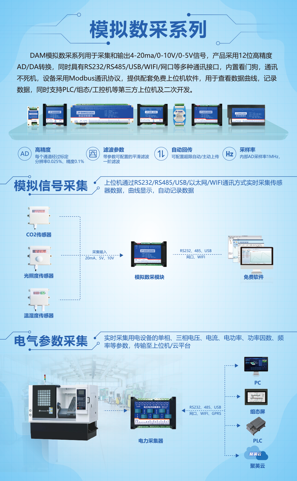 DAM模擬數采系列用于采集和輸出4-20ma/0-10V/O-5V信號,產品采用12位高精度AD/DA轉換,同時具有RS232/RS485/USB/WIFI/網口等多種通訊接口,內置看門狗,通訊不死機,設備采用Modbus通訊協議,提供配套免費上位機軟件,用于查看數據曲線,記錄數據,同時支持PLC/組態/工控機等第三方上位機及二次開發。