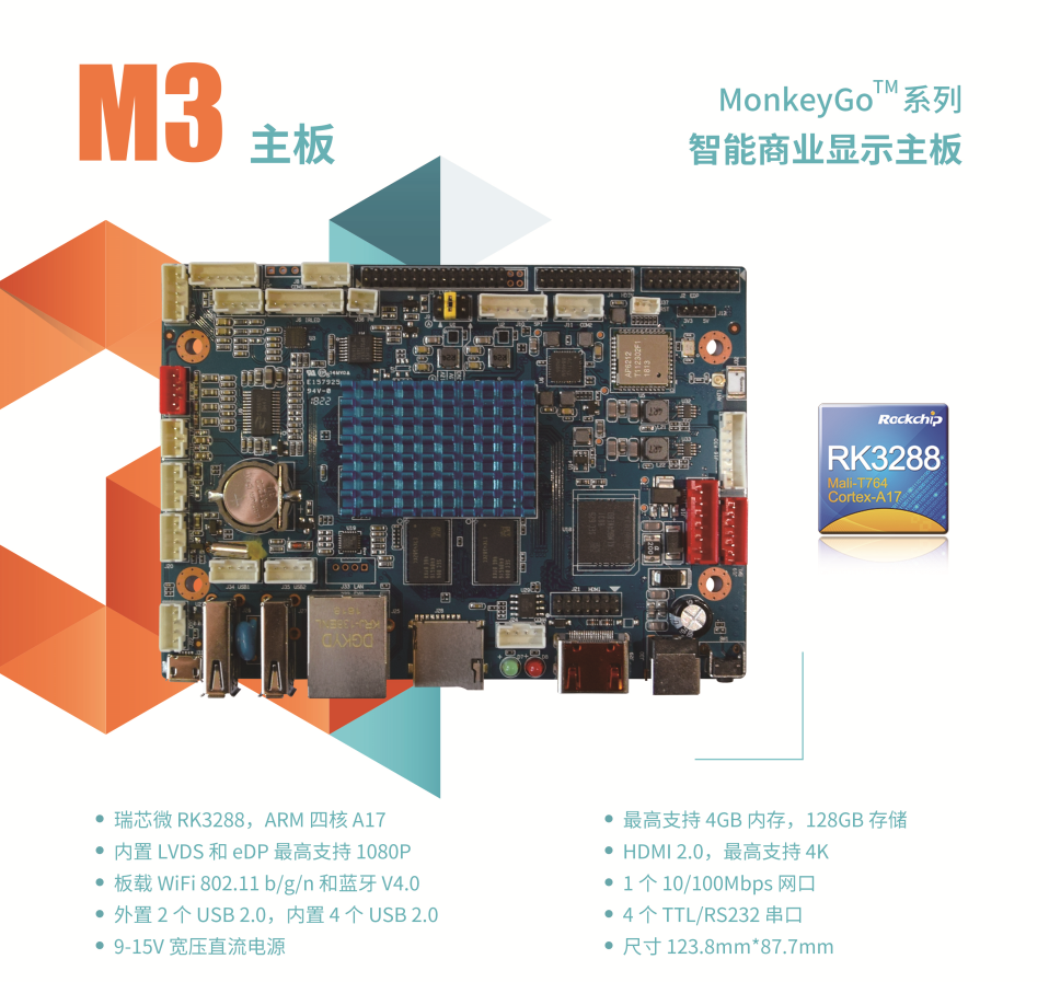 這款產品廣泛適用于廣告機、車載設備、觸摸應用、商用自助設備、工業自動化等領域。CPU采用的是瑞芯微RK3288四核A17方案,DDR和Flash全部選用三星、現代等大廠。接口豐富,支持市面上大部分單雙路6位/8位LVDS液晶屏,同時兼容JEIDA和VESA模式。