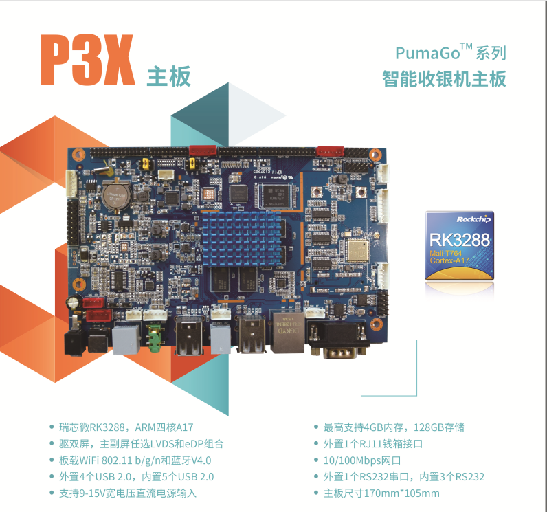 智能收銀機作為能聚合多種支付方式的硬件工具,在配置安卓操作系統之后,能進一步滿足會員營銷、數據分析、智能管理等多方面需求,將成為店鋪智能化升級的關鍵入口。這款主板CPU型號為瑞芯微RK3288,ARM四核A17芯片,驅雙屏,主副屏任選LVDS和eDP組合,板載WiFi802.11b/g/n和藍牙V4.0,外置4個USB 2.0,內置5個USB 2.0,支持9-15V寬電壓直流電源輸入,最高支持4GB內存、128GB存儲。