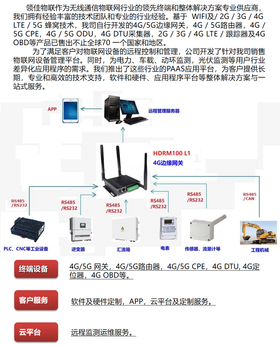深圳市領佳物聯科技有限公司成立于2011年,是由一群從事多年無線通訊行業資深專家組成的團隊,具有多年的物聯網產品開發經驗,對寬帶,工業物聯網及車聯網等應用場景有資深的經驗與理解。公司專注于研發銷售4G/5G戶外路由器, 4G/5G CPE,4G/5G家庭網關, 3G/4G/5G/WIFI工業路由器, 4G/5G邊緣計算網關, DTU, 2G/3G/4G/CAT 1跟蹤器, 4G OBD, 4G 車載T-BOX, 433M/LORA采集器等終端。同時,公司為客戶提供設備遠程管理,電力/車載應用管理等云平臺,APP,小程序。為客戶提供完從終端,邊緣計算,云平臺的系統整體解決方案。為工業設備連接,安防監控,電力安全監測,能效管理,電力抄表,行能源電站監測,車輛防盜,物流追蹤,資產跟蹤,數據分析,寬帶覆蓋等提供可靠的數據鏈路及監測運維管理解決方案。