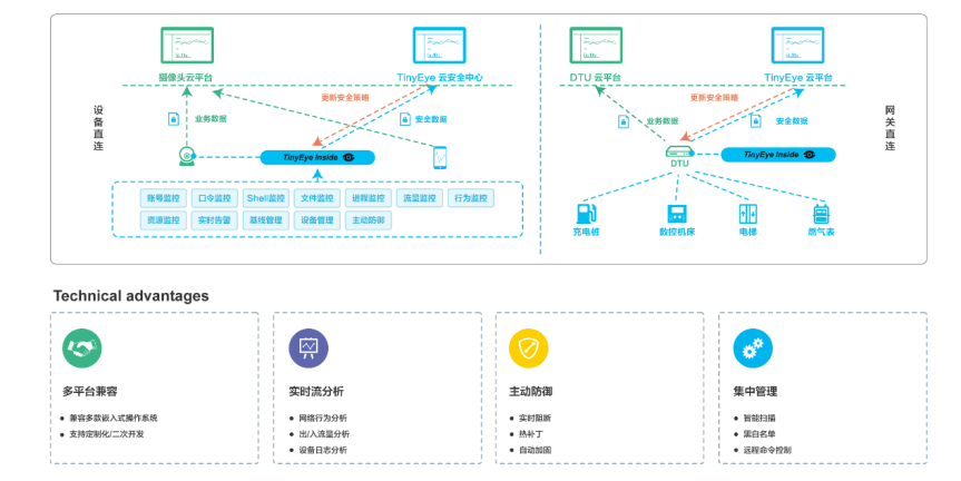 青蓮云物聯網終端安全管理系統(TinyEye)提供跨平臺的終端安全管理能力,覆蓋系統基線安全、文件安全、登陸安全、流量安全、行為安全等全方位的終端設備監控體系,將處于企業IT系統邊界防護之外的終端設備統一集中管理,實現從傳統信息安全時代的邊界防護到物聯網設備邊緣防護的安全升級。通過說安全管理平臺的聯動,可以針對異常攻擊行為進行主動防御,實現精確到每臺設備的實施安全管控。