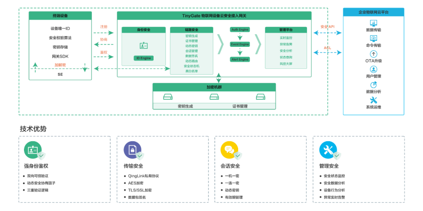 TinyGate物聯網云安全網關是云訪問安全代理技術(CASB)在物聯網的實際應用。云安全網關作為網絡代理服務部署在云端,通過在設備端植入網關SDK來連接物聯網設備和上層業務云平臺,提供兩者之間的雙向安全通道,安全能力主要包括鏈路、通信、數據、身份、鑒權、加密、合規等方面,全面保障物聯網應用場景下的通信鏈路安全。云網關同時支持安全芯片和ARM TrustZone兼容能力,支持軟/硬件加解密兩種方式。