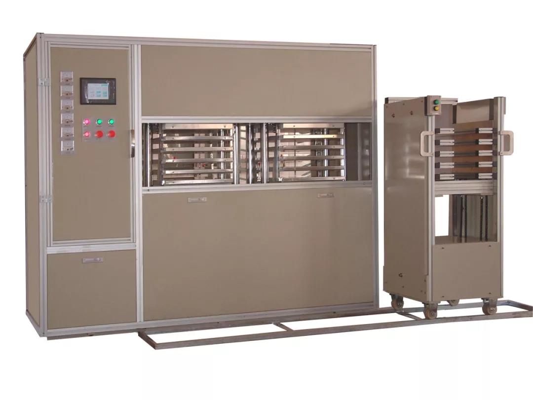 采用旋轉式全自動上料方式,實現上料升降倉、熱壓倉、冷壓倉三個工位倉同步自動進出料,配合上翻轉上料器使用,可以大大降低工作強度,簡捷、高效。