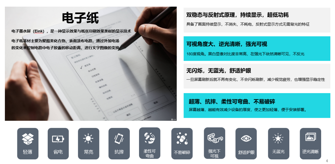 電子紙(Electronic paper,簡稱E-paper)也稱電子墨水屏(Eink),是一種顯示效果與紙張印刷效果類似的顯示技術。電子紙最顯著的優點是基于雙穩態與反射式兩大原理,具備了畫面持續顯示,不消失、不耗電,反射式顯示方式無需背光的特征。它方便攜帶,輕薄,可略微彎曲,其視角可達180°,在強烈的陽光下,電子紙上的顯示內容也清晰易讀,將逐步代替傳統的紙張、液晶電子屏顯示,實現低能高效的無紙無電化顯示。