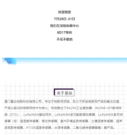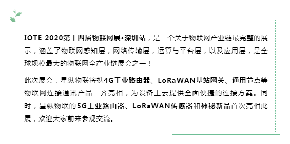 特別感謝大家對星縱物聯一如既往的支持與厚愛,7月29日-31日星縱與您相約在深圳會展中心-“IOTE 2020第十四屆國際物聯網展·深圳站”( 9號展館、9D17展區)。誠邀大家屆時蒞臨我司展位參觀、交流。