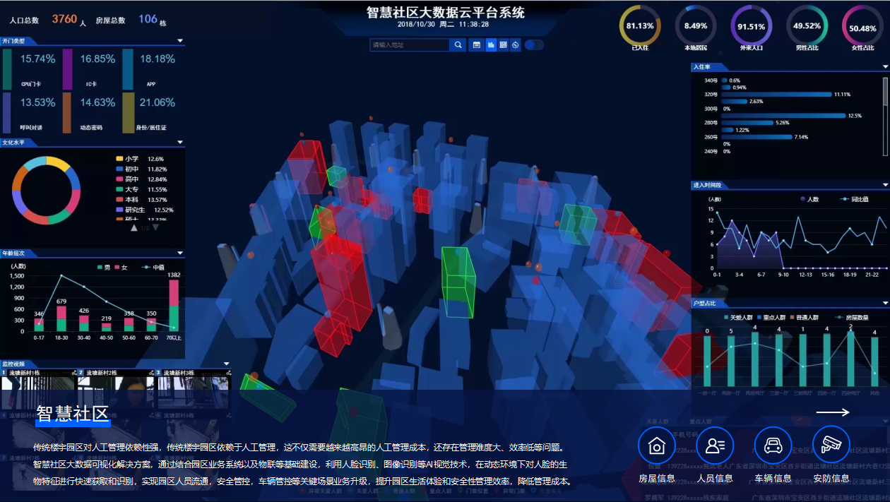 傳統樓宇園區對人工管理依賴性強,同時還存在管理難度大、效率低等問題。智慧社區大數據可視化解決方案,通過結合園區業務系統以及物聯等基礎建設,利用人臉識別、圖像識別等AI視覺技術,在動態環境下對人臉的生物特征進行快速獲取和識別,實現園區人員流通,安全管控,車輛管控等關鍵場景業務升級,提升園區生活體驗和安全性管理效率,降低管理成本。