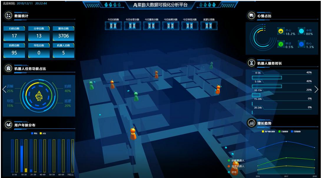 智慧機器人解決方案能夠以服務機器人作為對象,以景區、展廳、商城等作為場景,將機器人服務游客過程的數據進行可視化,實時掌握景區人群密度、游客問題、幫助改善景區服務。同時,智慧機器人也能通過實時互動進行交易,以得到交易數據統計和游客轉化率。