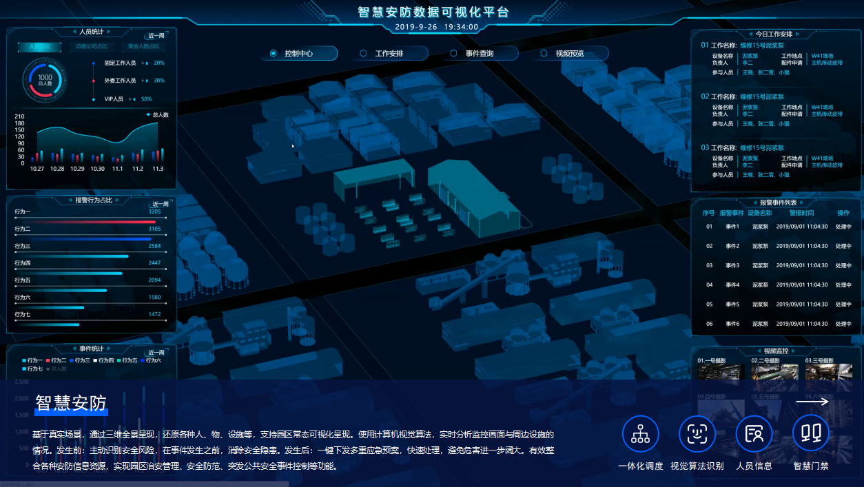 基于真實場景,通過三維全景呈現,還原各種人、物、設施等,支持園區常態可視化呈現。使用計算機視覺算法,實時分析監控畫面與周邊設施的情況。主動識別安全風險,消除安全隱患。遇到突發事件后一鍵下發多重應急預案,快速處理,避免危害進一步闊大。有效整合各種安防信息資源,實現園區治安管理、安全防范、突發公共安全事件控制等功能。