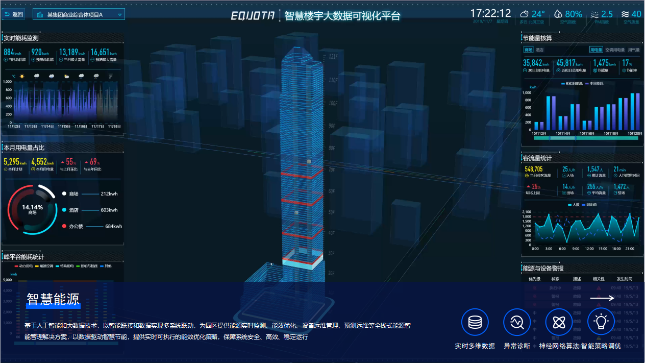 基于人工智能和大數據技術,以智能聯接和數據實現多系統聯動,為園區提供能源實時監測、能效優化、設備運維管理、預測運維等全棧式能源智能管理解決方案,以數據驅動智慧節能,提供實時可執行的能效優化策略,保障系統安全、高效、穩定運行