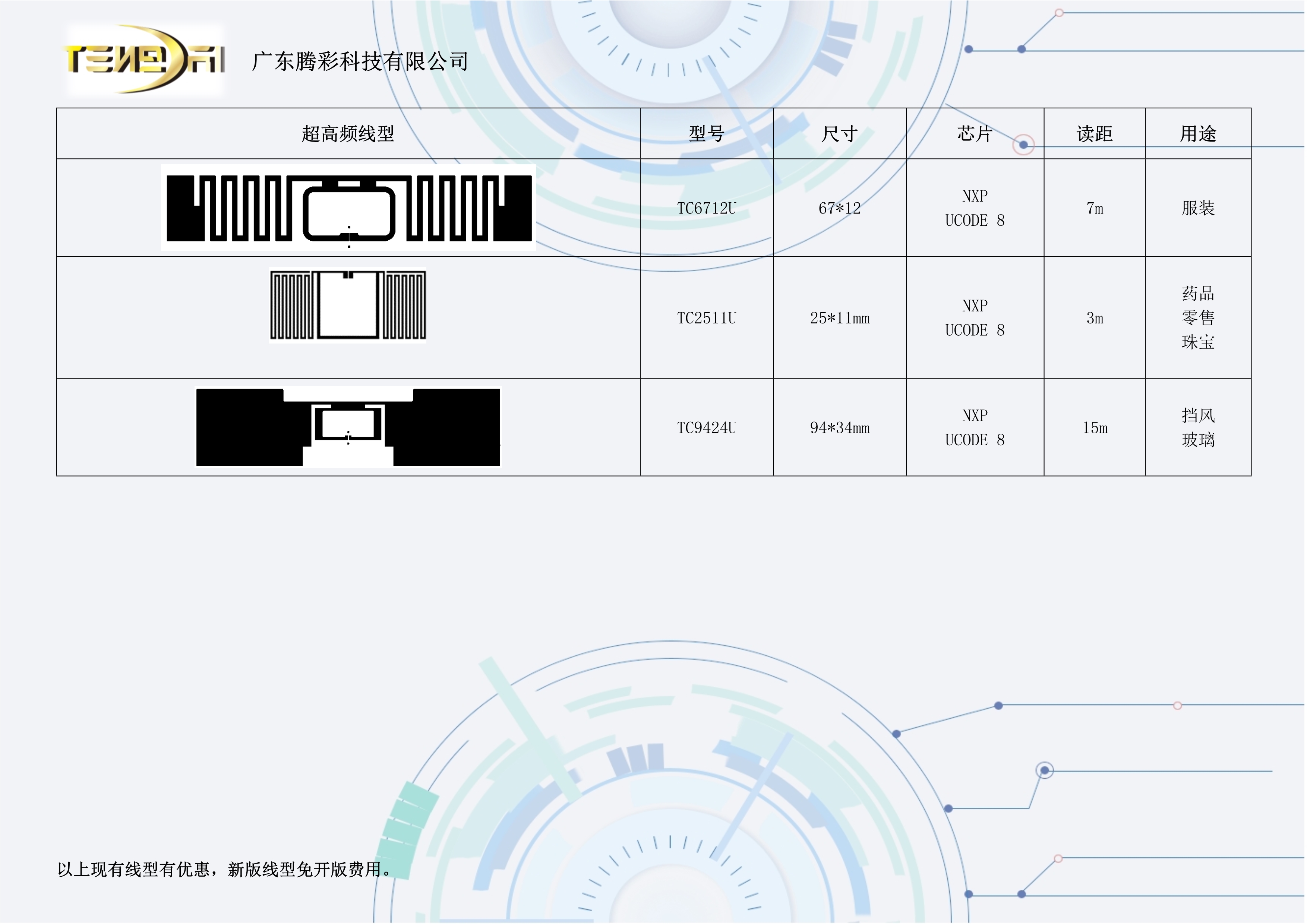 公司引進3臺德國紐豹DDA40K芯片封裝設備,RFID專用復合設備,芬蘭VOYANTIC檢測儀等專業設備,預計年產3億枚超高頻RFID inlay,面向倉儲航空物流、智能圖書館、服裝盤點、珠寶管理等應用場景,提供全球領先的標簽產品,致力于提供業內同行代工服務。