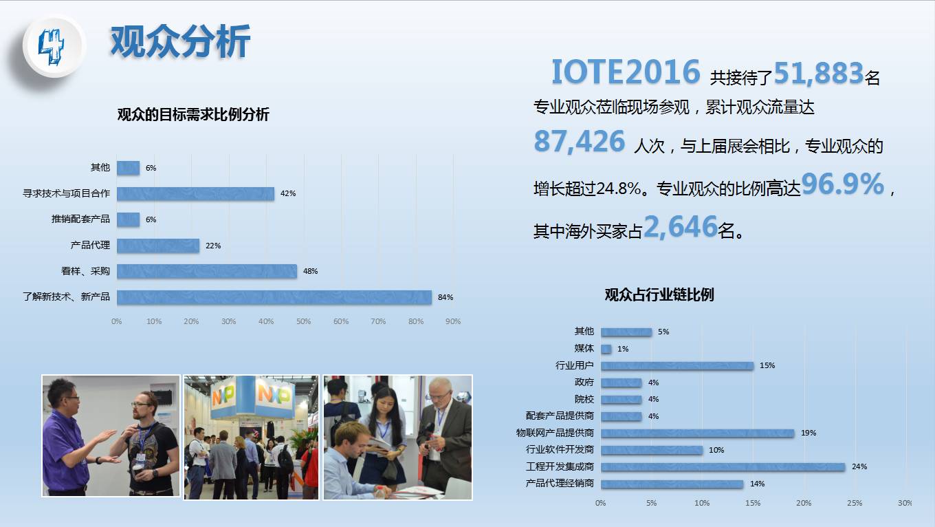IOTE2016已完美落幕,據統計為期三天的展會共吸引了來自美國、德國、加拿大、英國、芬蘭、韓國、中國臺灣、香港等近二十個國家和地區的453多家國內外企業參加了展會和高峰論壇,51,883名專業觀眾蒞臨現場參觀,累計觀眾流量達87,426人次。 專業觀眾的比例高達96.9%,其中海外買家占 4.1%。展望2017