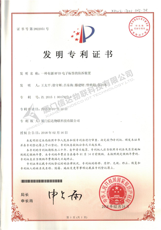 近日,信達物聯一項名為《一種有源RFID電子標簽的防拆裝置》的發明專利通過國家知識產權局為期三年的審查,獲得授權,專利號為:ZL 2015 1 0017927.0。