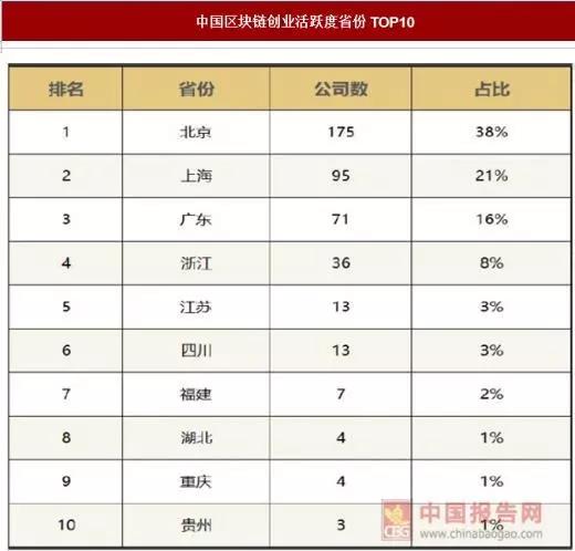 從中國區塊鏈公司的地域分布狀況來看,北京、上海、廣東、浙江依然是區塊鏈創業的集中地,四地合計占比超80%。其中,北京以175家公司、占比38%處于絕對的領先地位;上海以95家公司,占比21%位居第二;廣東省以71家公司、占比16%位居第三;浙江省以36家公司、占比8%位居第四。除此以外,中國區塊鏈創業活躍度前十名的省份還包括江蘇、四川、福建、湖北、重慶、貴州。