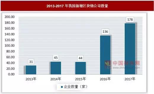 從中國區塊鏈產業的新成立公司數量變化來看,2014 年該領域的公司數量開始增多,到2016年新成立公司數量顯著提高,超過100家,是2015年的3 倍多。2017年是近幾年的區塊鏈創業高峰期,由于區塊鏈概念的快速普及,以及技術的逐步成熟,很多創業者涌入這個領域,新成立公司數量達到178家。