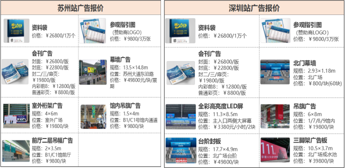 注1:以上報價不包含特裝管理費、展具租賃費及額外用電租賃安裝費。 注2:標準展位為3m×3m,配備:白色圍板、一桌、二椅、二燈、中英文楣板、地毯,插座。 注3:館內凈空地36㎡起租,非標準展位不帶任何設施,由參展單位自行或委托設計、裝修。 |